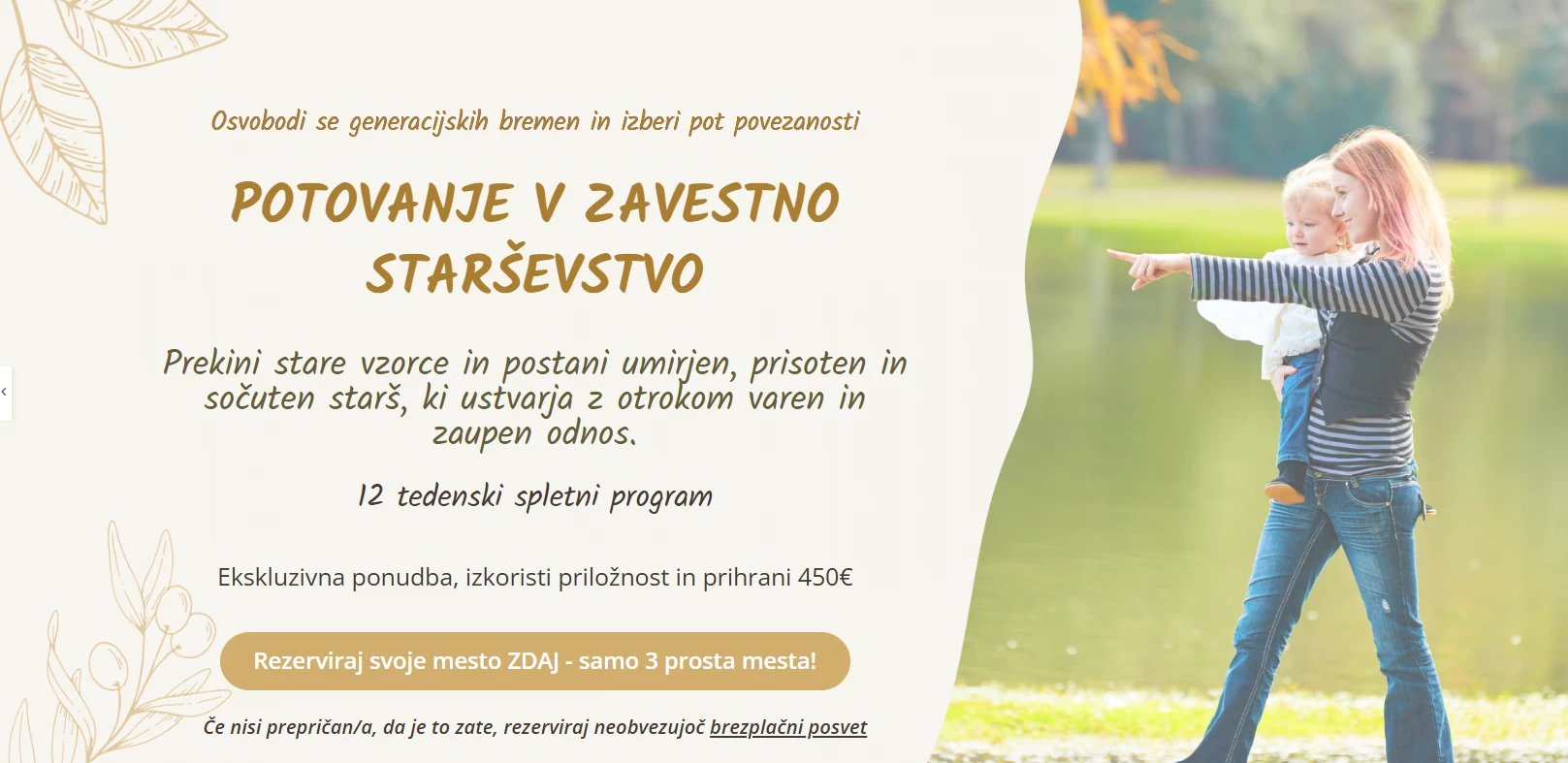 Ob vpisu v program Potovanje v zavestno starševstvo, v katerem spreminjamo generacijske vzorce ter se učimo veščin zavestnega starševstva, ti tokrat podarim še 5-dnevni izziv Sočutje do sebe, kjer se naučiš v praksi, kaj pomeni sočutje do sebe in kako to orodje uporabiti za celjenje svojih čustvenih ran.